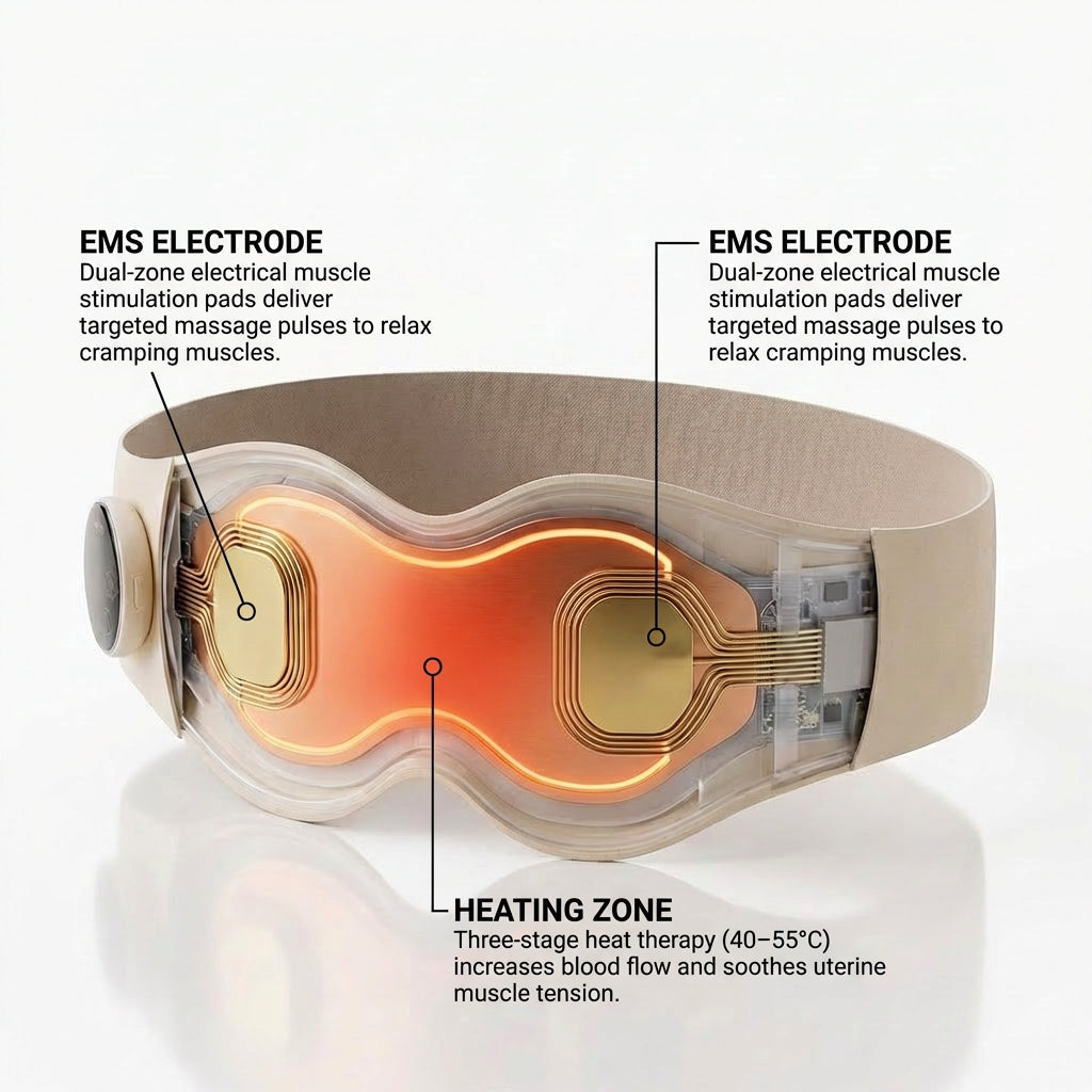 Heat opens blood flow. EMS releases muscle tension. Together, they address period pain from two directions simultaneously,