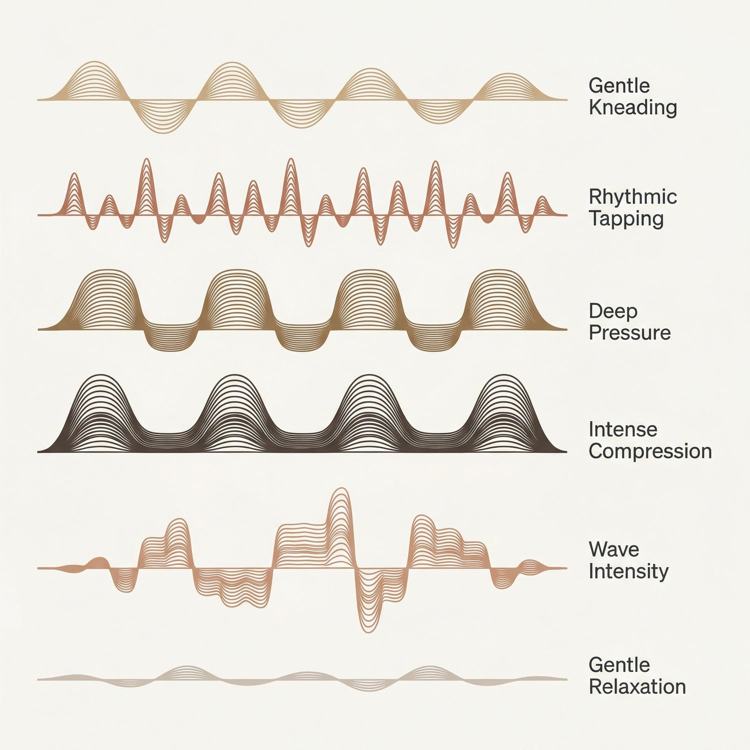 A: Each mode has a unique pulse pattern: Mode 1 (Gentle Kneading) is rhythmic and soothing; Mode 2 (Rhythmic Tapping) alternates light and firm pulses; Mode 3 (Deep Pressure) delivers sustained compression; Mode 4 (Intense Compression) is maximum intensity; Mode 5 (Wave Intensity) has layered rise-and-fall patterns; Mode 6 (Gentle Relaxation) is